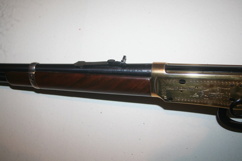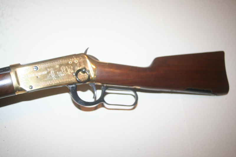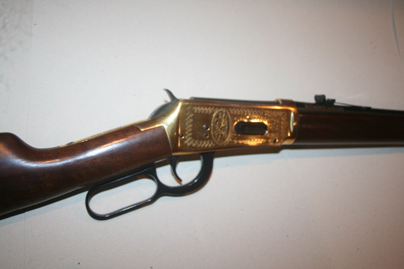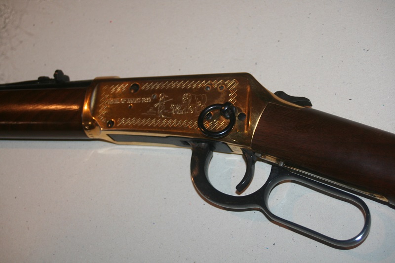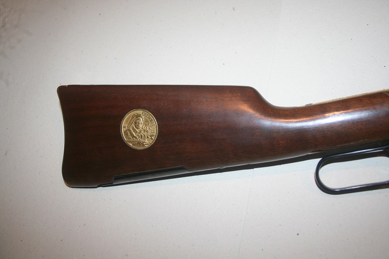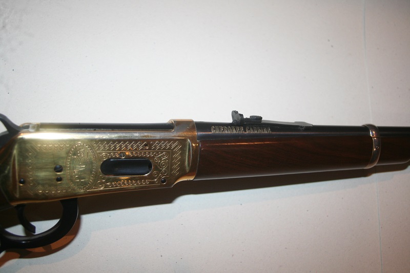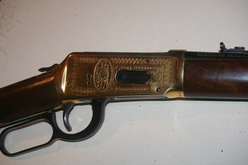 Carabine de selle Winchester Cherokee Carbine, modèle 94 Trail of Tears 1839. Calibre .30-30 Win. Canon rond de 51 cm, bronzé. Boîtier gravé et doré. Crosse en noyer de 34 cm, avec médaille incrustée et logement pour quatre cartouches, avec 4 cartouches neutralisées